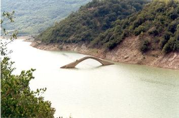 Το γεφύρι είναι εντυπωσιακό, μονότοξο, με ύψος 22 μέτρα και άνοιγμα τόξου περίπου 30 μέτρα. Σώζεται ακόμα εντοιχισμένη επιγραφή που γράφει: ‘’ΕΚΤΙΣΘΗ ΤΟ 1659, ΟΙ ΚΤΗΤΟΡΕΣ ΔΗΜΗΤΡΙΟΣ ΚΑΙ ΜΑΝΩΛΗΣ’’. Χρησιμοποιήθηκε ανελλιπώς επί 3 ολόκληρους αιώνες ως το μοναδικό πέρασμα από το Καρπενήσι προς τη δυτική Στερεά Ελλάδα, μέχρι την κατασκευή του φράγματος και τη δημιουργία της λίμνης των Κρεμαστών τη δεκαετία του ’60. Από τότε η στάθμη του νερού ανέβηκε, ο Αγραφιώτης έγινε κάτι μεταξύ ποταμού και λίμνης, αλλά το μοναδικό αυτό μνημείο δεν έχασε την αίγλη του. Μπορεί να έπαψε να εξυπηρετεί τους οδοιπόρους, όμως έγινε ένα πολύ ιδιαίτερο αξιοθέατο, ένα αξιοθέατο που ποτέ δεν παρουσιάζει την ίδια εικόνα στον επισκέπτη, καθώς ανάλογα με τη στάθμη της λίμνης πότε βυθίζεται σχεδόν ολόκληρο και χάνεται και πότε αναδύεται παρουσιάζοντας μια όμορφη μα και μυστηριακή εικόνα. Μία αδιάκοπη μάχη δηλαδή, στην οποία πότε βγαίνει νικητής το γεφύρι και πότε η λίμνη. Μία μάχη την οποία εποπτεύει η φύση και βάζει τους δικούς της κανόνες. Μία μάχη πολύ διαφορετική από εκείνη του 1807 μ.Χ. όταν κλεφταρματωλοί του Κατσαντώνη συγκρούστηκαν με Τουρκαλβανούς του Άγου Μουχουρτάρη που προσπάθησαν να τους εμποδίσουν τη διάβαση από το γεφύρι. Σ’ αυτή τη συμπλοκή σκοτώθηκαν 80 Τουρκαλβανοί και 10 Έλληνες, ανάμεσά τους και ο Βασίλης Δίπλας, νονός του Κατσαντώνη, στα 75 του χρόνια. Στις μέρες μας σ’ αυτή την πανέμορφη γωνιά της Ευρυτανίας διοργανώνονται μαθήματα κανό – καγιάκ από τη Δυτική Φραγκίστα. Εμείς για να φτάσουμε ως εδώ, ακολουθούμε από το Καρπενήσι το δρόμο προς Αγρίνιο και μετά τη Δυτική Φραγκίστα παίρνουμε το δρόμο προς Τσούκα και λίγο αργότερα θα το δούμε στο αριστερό μας χέρι.